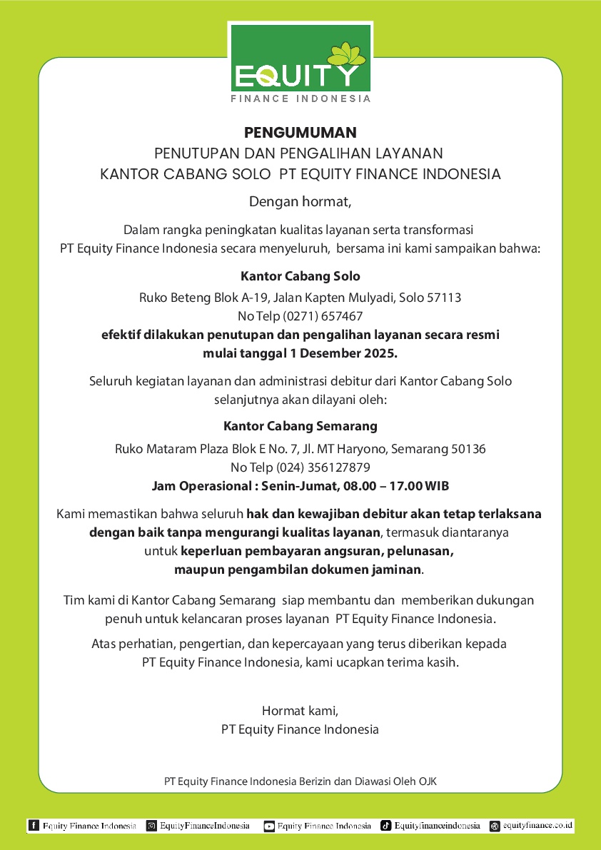 Penutupan dan Pengalihan Layanan Kantor Cabang Solo PT Equity Finance Indonesia